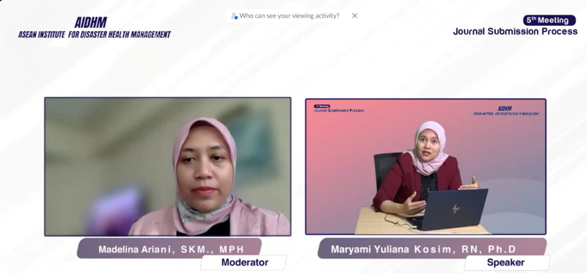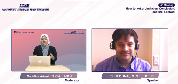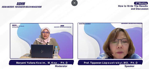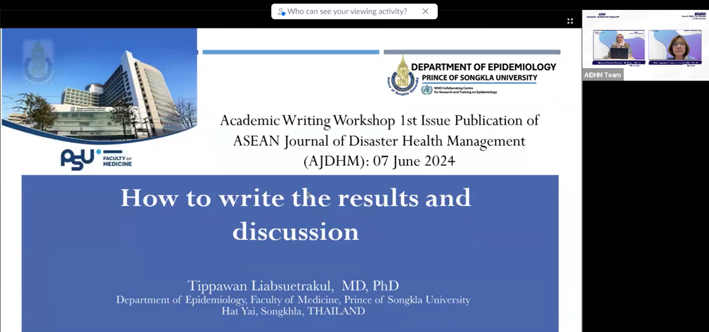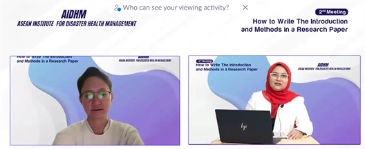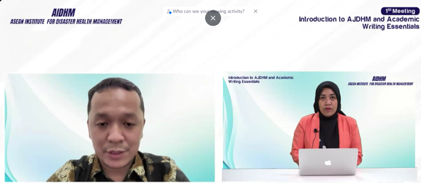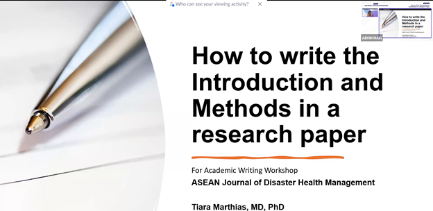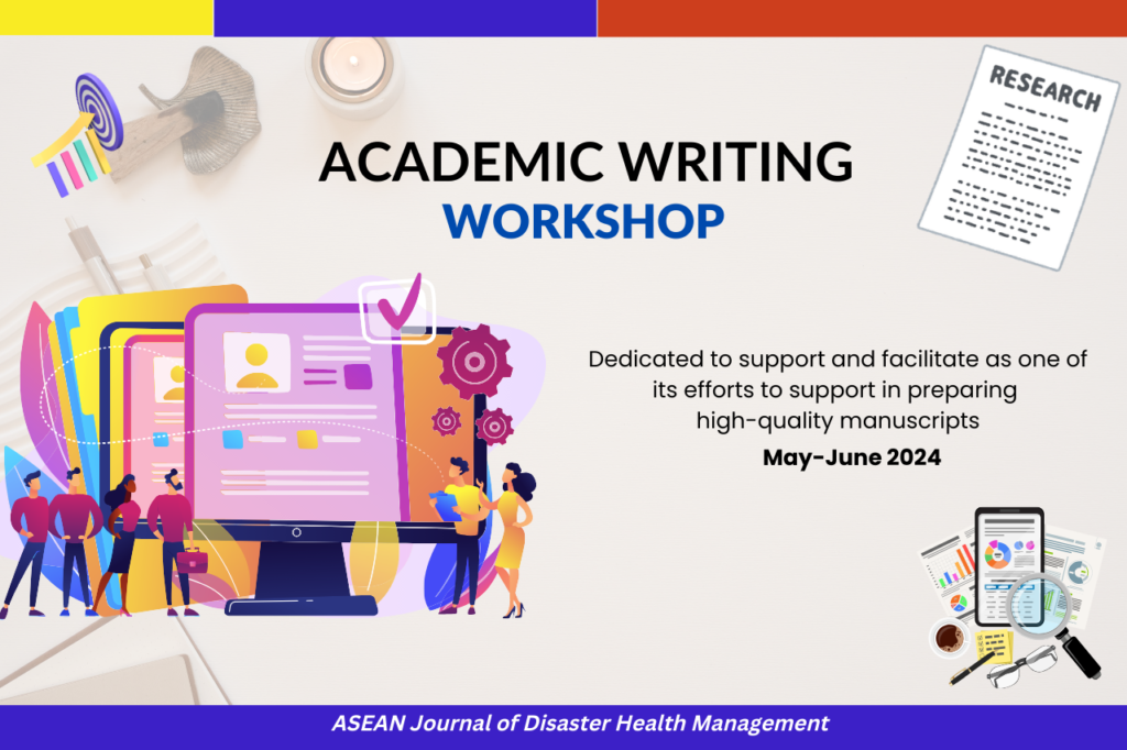 In order to support and facilitate the 1st issue publication of  ASEAN Journal of Disaster Health Management (AJDHM) preparations, the ASEAN Institute for Disaster Health Management (AIDHM) Secretariat initiated a webinar series of Academic Writing Workshop as one of its efforts to support the candidate authors and broader access in preparing the high-quality manuscripts to be submitted to AJDHM. This workshop was held from May to June 2024, with each session focused on specific aspects of academic writing and manuscript preparation. This workshop was designed to progressively build confidence in academic writing.